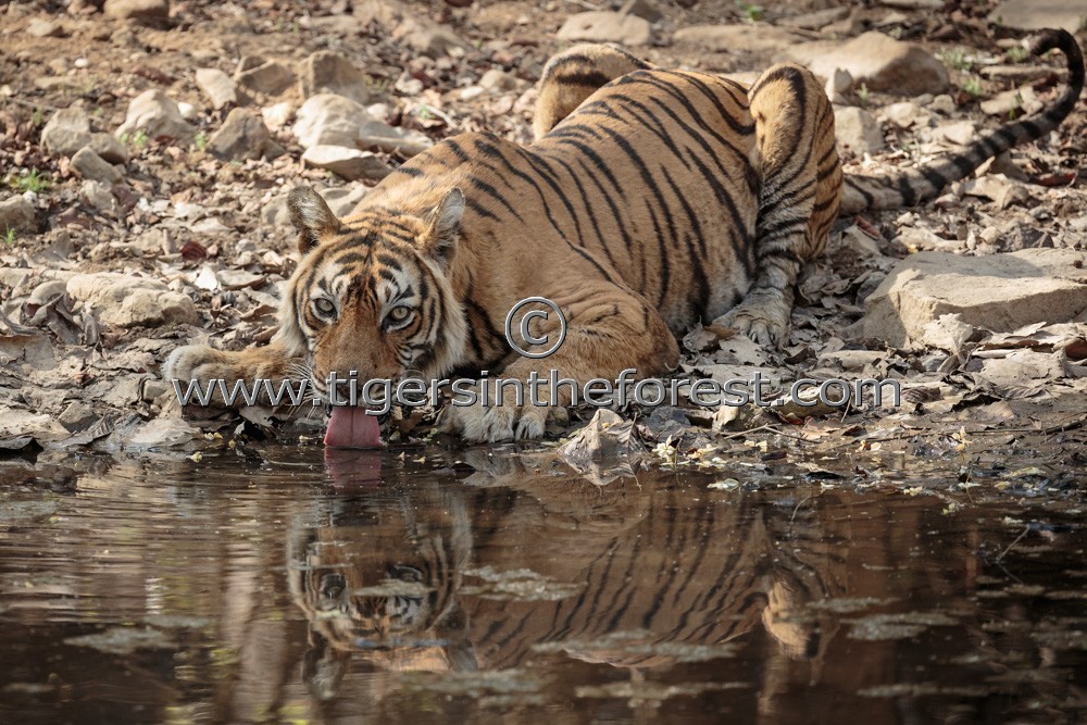 During May 2014 I was fortunate to spend about 15 minutes photographing Machali. This wonderful tigress now in her 17th year appeared from her forest cover to drink at a waterhole. The photo shows Machali quenching her thirst with her refection in the water.