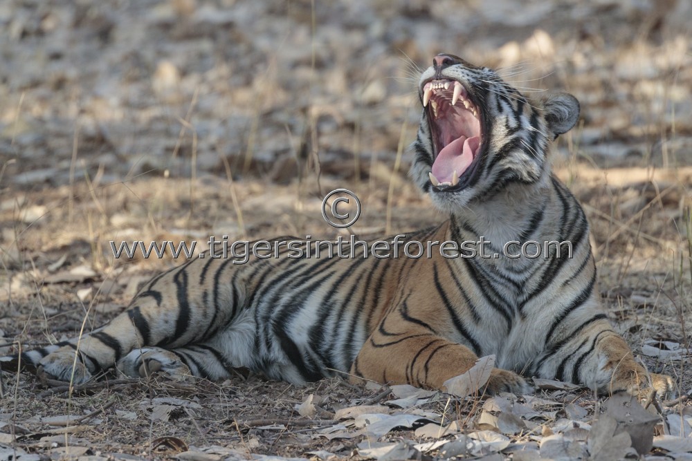 Young Ranthambhore male tiger yawning and displaying his huge canine teeth.